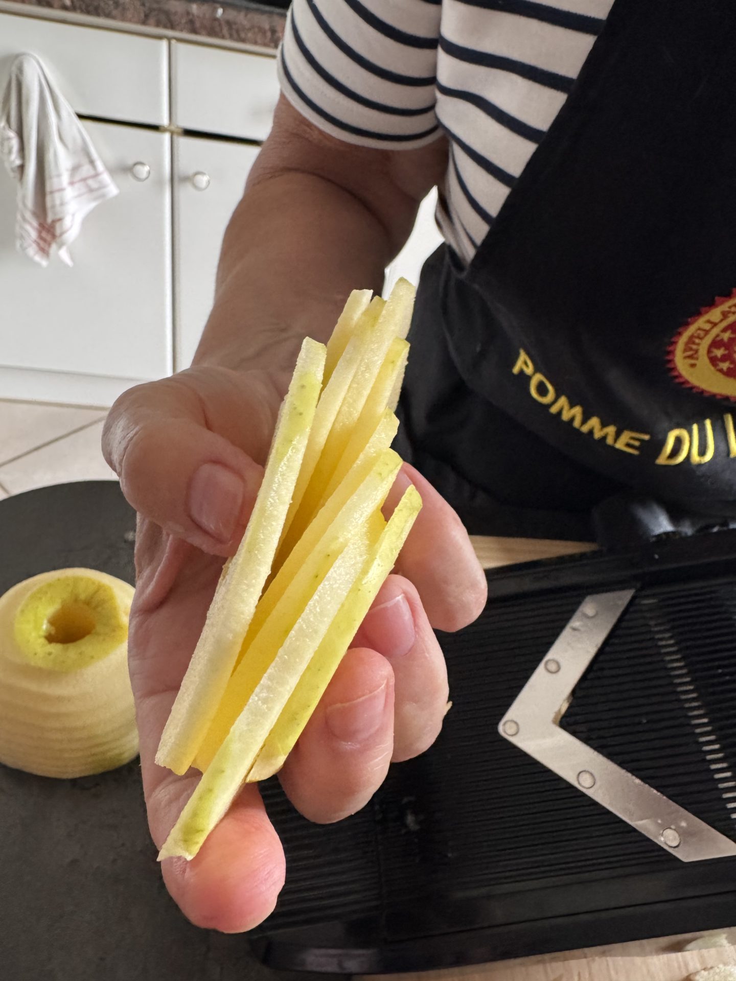 Peler les Pommes du Limousin, ôter le trognon et les passer à la mandoline pour obtenir des tranches bien fines. Les déposer dans un saladier avec le rhum, la vanille et la cannelle ainsi que des raisins secs, des amandes effilées si vous le souhaitez.