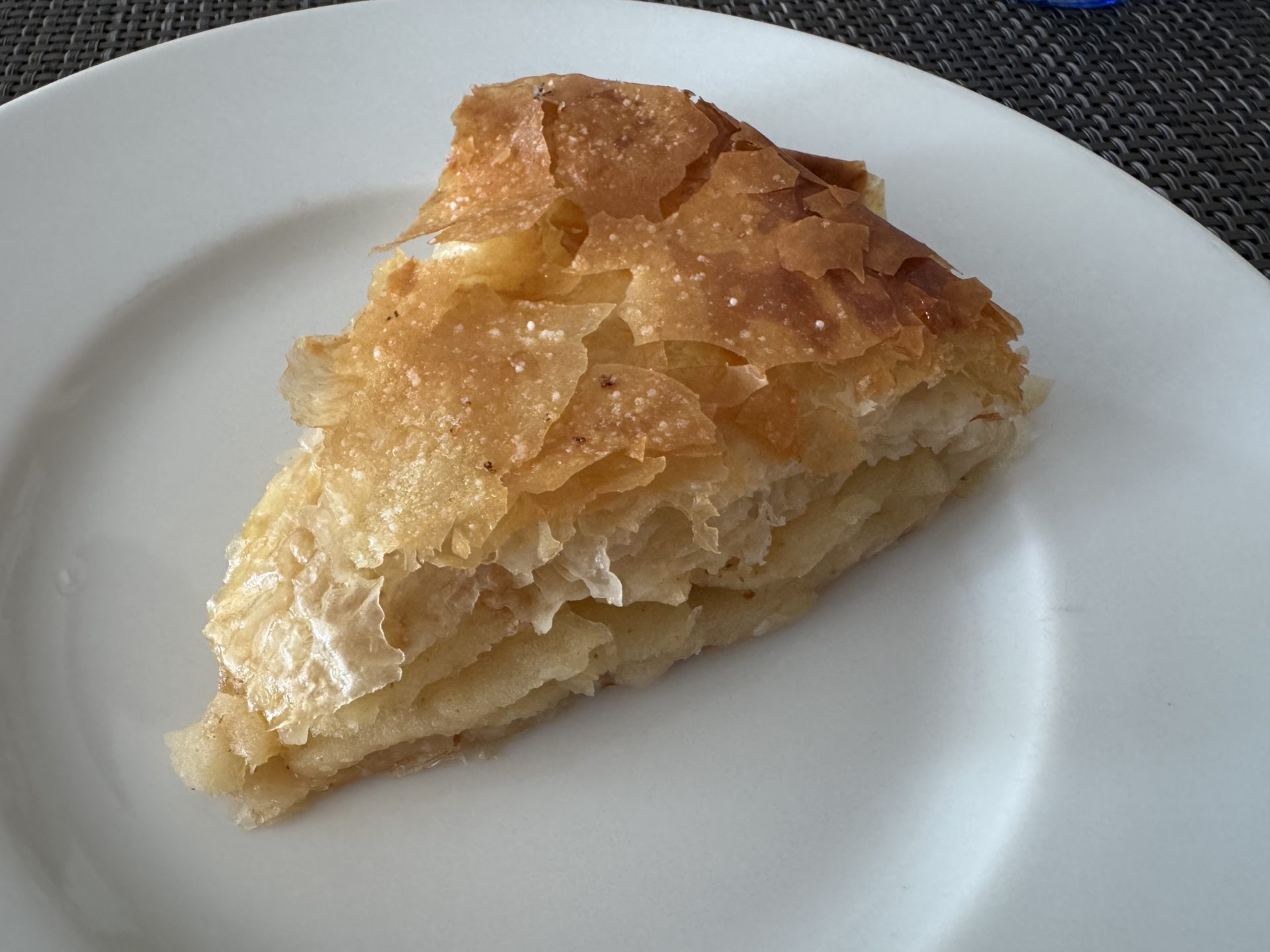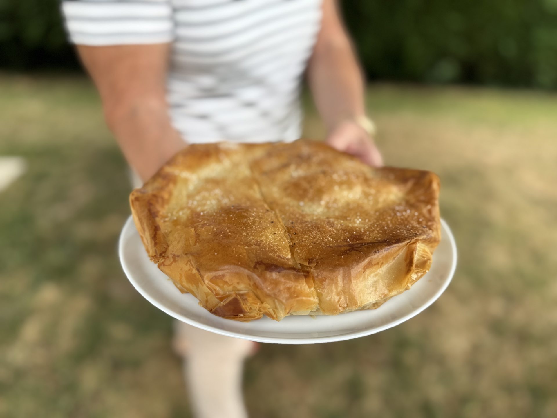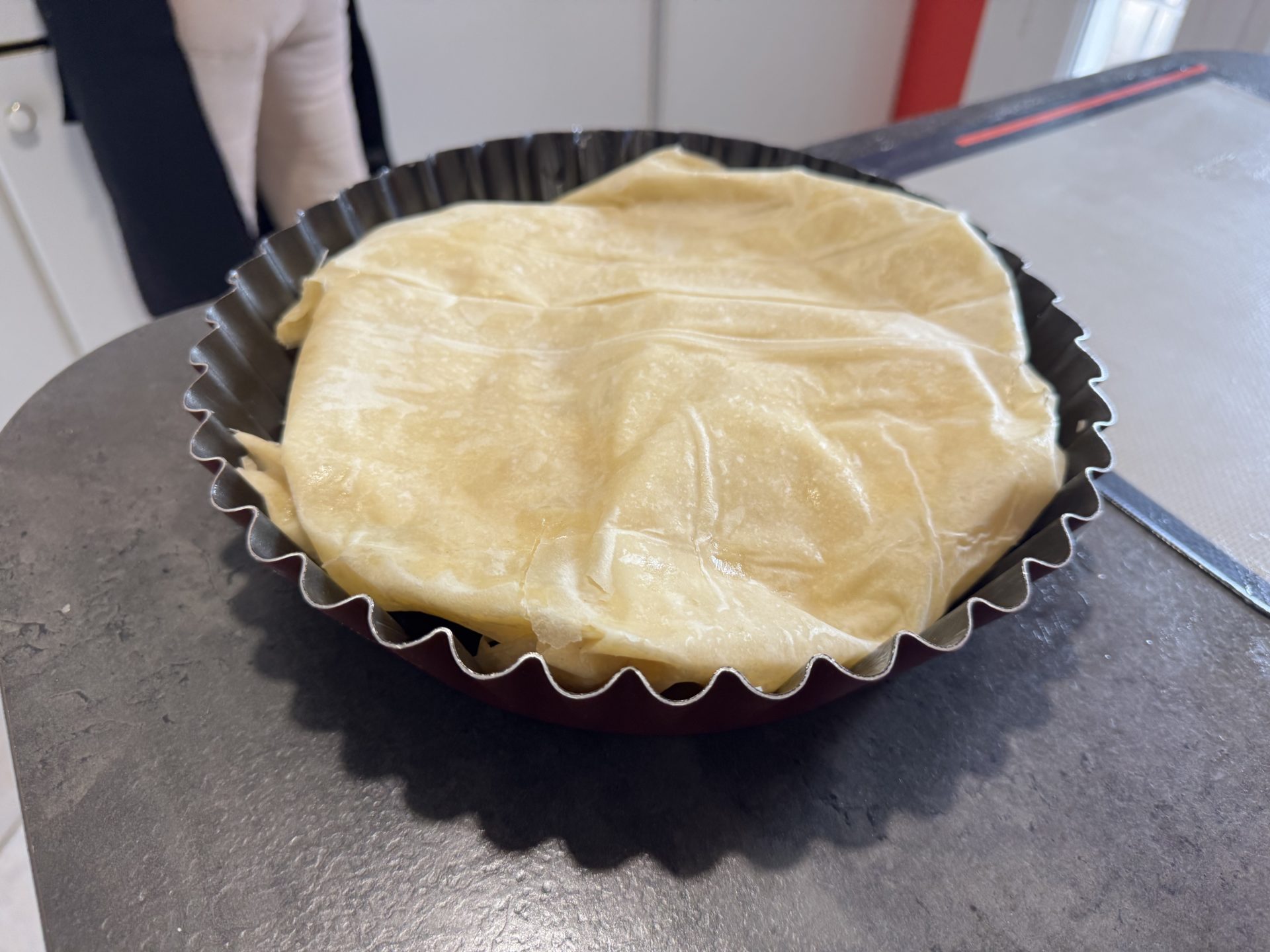 Préchauffer votre four à 200°. Faire fondre le beurre et beurrer une première feuille de pâte filo, la foncer dans votre tourtière, saupoudrer de quelques grains de sucre et déposer des pommes marinées. Recouvrir d'une nouvelle feuille de filo beurrée et légérement sucrée et ainsi de suite jusqu'à épuisement des pommes et de la dernière feuille de filo beurrée et sucrée qui recouvrira la croustade.Rentrer les bords de la dernière feuilles pour bien fermer la croustade et enfourner pour 35mn à four chaud 180/190 degrés.
